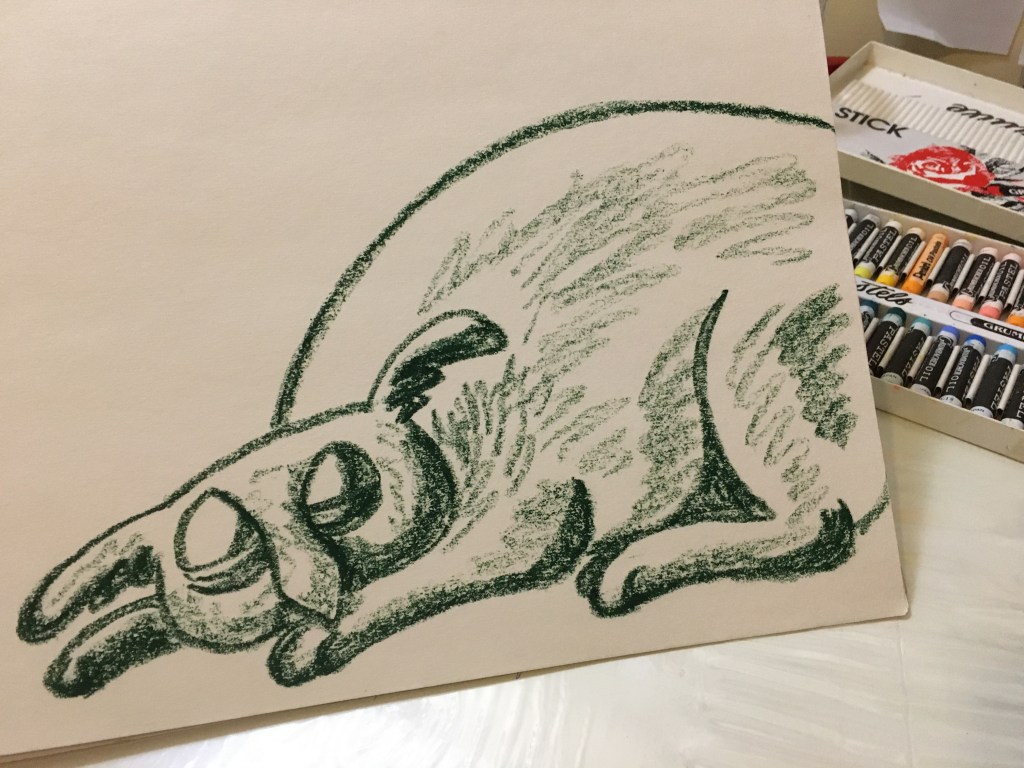 I knew this medium would help set me up for this “therapeutic art” session. And it worked. Instead of first sketching and perfecting the outlines of an image, I drew with the pastels directly onto the paper, trusting the permanence of the lines as I laid them down. I let it happen. I didn’t fight anything yet I felt in control. I limited expectations. I mixed colours. I smeared the oily pigments with my bare fingertips. And this is what came out— a creature seemingly born from those grassy cliffs of Ogden Point in beautiful Victoria, British Columbia. I still plan on adding in that mountain crested background another day, but for now, this Peaceful Breezer sleeps in the caress of the sun without a worry in mind. She reminds me, and anyone else who wishes to take her lead, that stepping away to enjoy life’s simplicities, trusting the flow, and letting the breeze tousle your hair can sometimes be the best thing we can do for ourselves to come back to our centre. That and turning our fingertips green with creative delight…